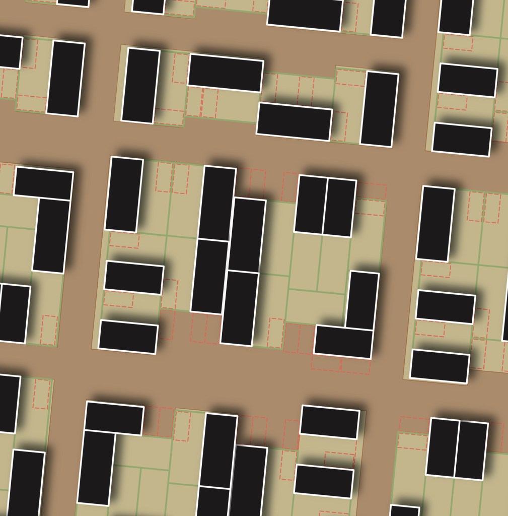 The diagram shows how this might be achieved. Shared-surface lanes service the homes and high garden walls with gates give privacy to gardens and screen car spaces from public view. This typology achieves net densities of 50 houses per Ha or 70+ units/Ha if some plots are a flat over bungalow configuration.